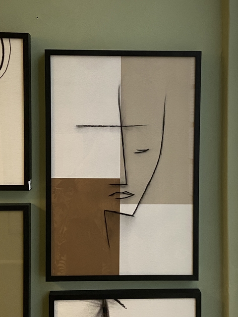 Quadro de gravura com desenho de traços de um rosto, e fundo dividido em 4 partes com cores diferentes. Com vidro e moldura preta, maravilhoso!